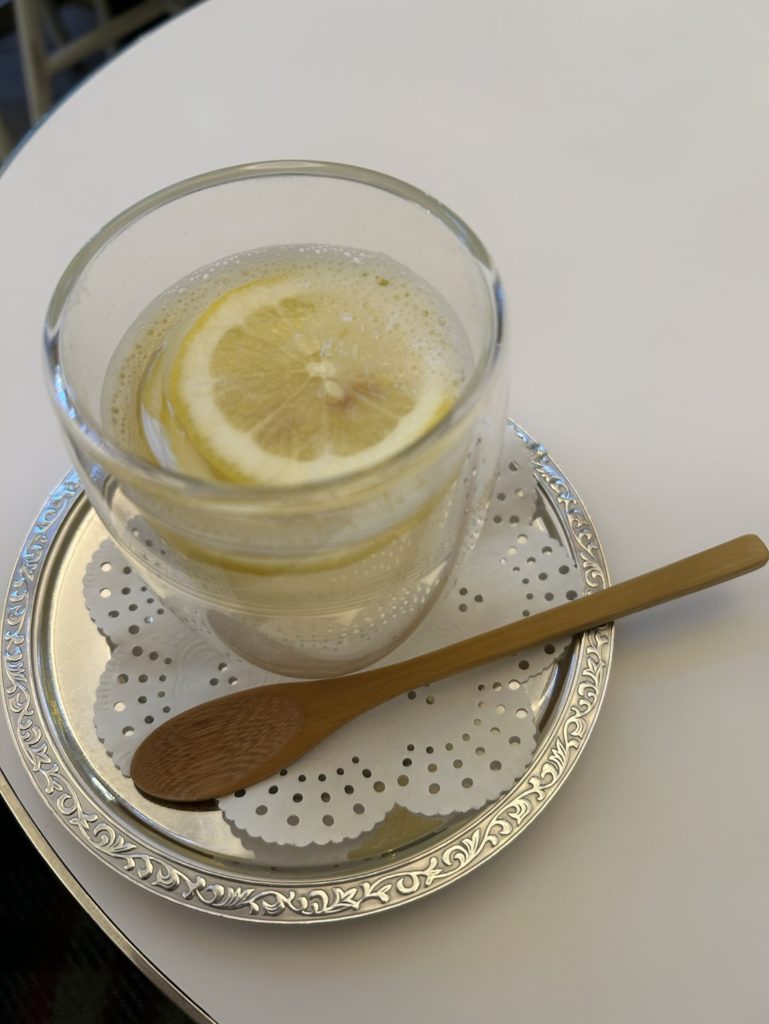 テラスは少し肌寒いのでホットレモネードをいただいた。